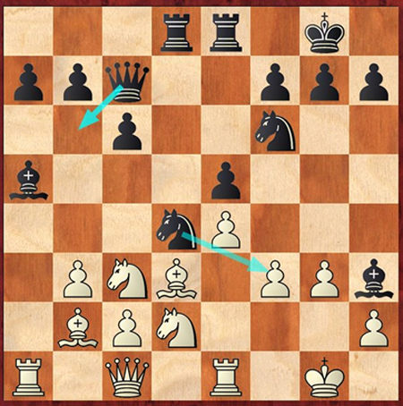 17…Фb6 18.Крh1 и здесь следует неожиданное 18…Кb3 19.cb, сразу побеждало Фf2, но черные захотели растянуть удовольствие, 19… Л:d3, на что у белых нашелся ответ 20.Ле2, но сопротивлялись белые недолго 20… Ле3 21.Фе1 Л:с3 22. Л:а5 Лс2 23. Ла2 Лd8 и тут черные решили погибнуть красиво: 24. Cd4 ed 25. Л:с2 d3, и на 26. Кс4 последовало изящное dc. Ферзя брать нельзя, так как последует Лd1, и на с1 появляется новый ферзь, а иначе черные остаются без фигуры и пары пешек, поэтому они сдались.