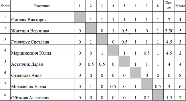 В женском первенстве борьбы не получилось, всех обыграв уверенно первое место заняла спортсменка из г.Лиды – Смоляк Виктория (тренер Левый), второе – третье место поделили более взрослые спортсменки Марцинкевич Юлия и Гончарук Светлана, лучшие дополнительные показатели у Марцинкевич – она вторая. Приз за волю к победе получила Семенова Анна.