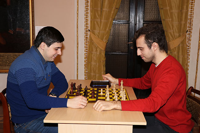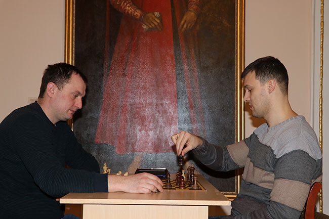 И вот, в прекрасном антураже Нового замка, среди величавых картин и старинной мебели, расположились столы, на которых гармонично стояли шахматные фигуры. И вот грянул бой, в ход пошли кони, слоны, к счастью это были только бескровные шахматные бои. Уже во втором туре схлестнулись Андрей Ольховик и Сергей Жук, в обоюдоостром сражении сильнее был Андрей, в следующем туре его поджидал еще один мастер Андрей Малюш, борьба плавно перешла в чуть лучший эндшпиль у меня, и в результате ошибки оппонента мне удалось победить.