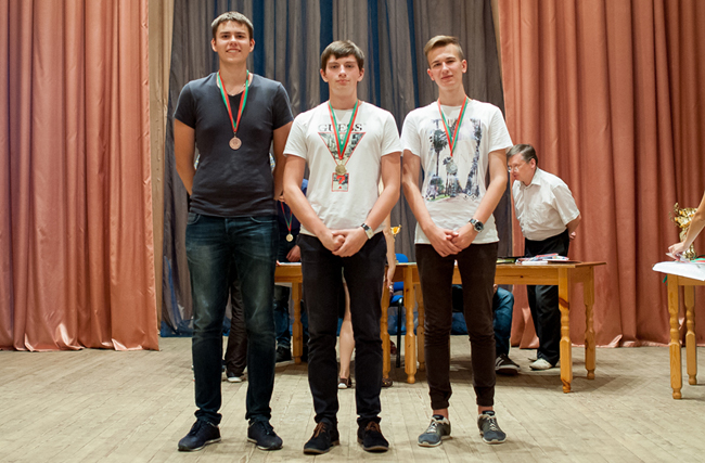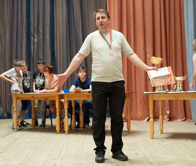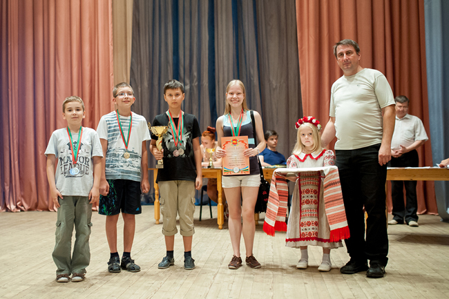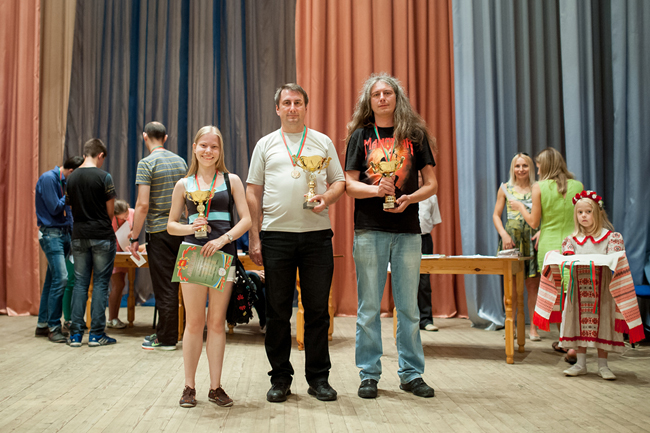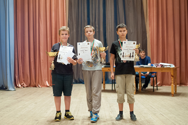 Вообще, зевки и не только матов – отдельная песня. Вдоволь насмотрелась я этого на рапиде. В 8 туре, к примеру, лидировавший Андрей Ольховик (на пол-очка отставали от него ближайшие преследователи Веремейчик и Алявдин) на ровном месте зевнул фигуру Бабенкову. Количество лидеров увеличилось, итог неясен был до последней минуты. Все-таки как важно выиграть последний «трудный самый» тур! Победы 10 тура решили исход рапида. Имевший максимальное количество очков (7) Ольховик с лишней пешкой в неясном эндшпиле по техническим причинам выиграл у Алексея Черепова, который совсем забыл, что иногда случаются цейтноты (тот уже давно пугающе кивал головой) и поэтому с конфуцианским спокойствием демонстрировал блиц замедленного действия. Сам виноват. Так, первым становится Андрей Ольховик. Павел Бабенков (тоже 7 очков) с треском проигрывает Алявдину и занимает 4 призовое место, пропуская соперника на 3 строку. На третьей доске сильно «забуксовавший» еще на старте и не сумевший догнать основных конкурентов Андрей Малюш вносит свою лепту в тему зевков, и Владимир Веремейчик вторым добегает до финишной ленточки. В детском рапиде победитель тоже определялся до последнего тура. 1 и 2 места заняли не проигравшие никому Лазавик Денис из Минска и Абразевич Евгений из Бобруйска. Тройку призёров замкнул Стрибук Артем. Ксюше Зеленцовой из Бобруйска чуть не повезло с коэффициентами, и она водрузилась посреди мальчишек на 4 место, уступив Марии Стамбровской (Могилев) первый приз среди девочек. Вот так нелегко сложились турнирные перипетии игроков в «легковесных» шахматах. Тем не менее, они внесли оживление в размеренный темп общего турнира.