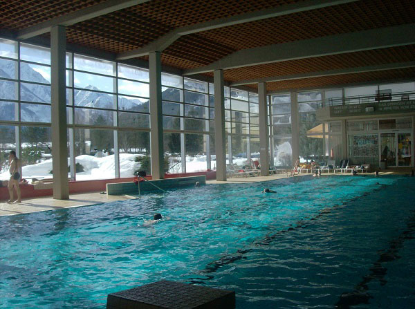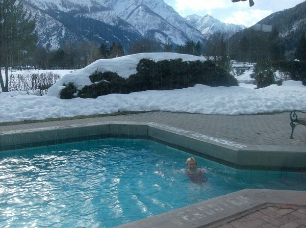 Несколько слов о бассейнах. Посмотрите, какие замечательные виды за окном. Более того, можно выплыть наружу в маленький, с подогретой водой. Ощущения исключительные, вокруг снег и горы, а вы сидите в воде!