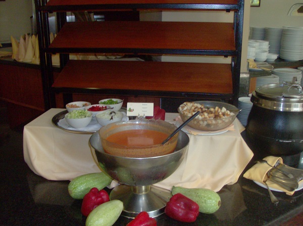 Паэ́лья (кат. Paella, произносится «паэльйа») — национальное испанское (валенсийское) блюдо из риса, подкрашенного шафраном, с добавлением оливкового масла. Кроме этого в паэлью могут добавляться морепродукты, овощи, курица. Название происходит от латинского слова patella — «сковорода».Гаспа́чо (исп. gazpacho) — блюдо испанской кухни ( «средиземноморской диеты»), холодный суп из перетёртых или пюрированных сырых овощей, прежде всего помидоров. Кроме них, в состав гаспачо входят оливковое масло и чеснок, огурец, сладкий перец, лук, уксус или лимонный сок, соль и могут быть добавлены пряности и хлеб.