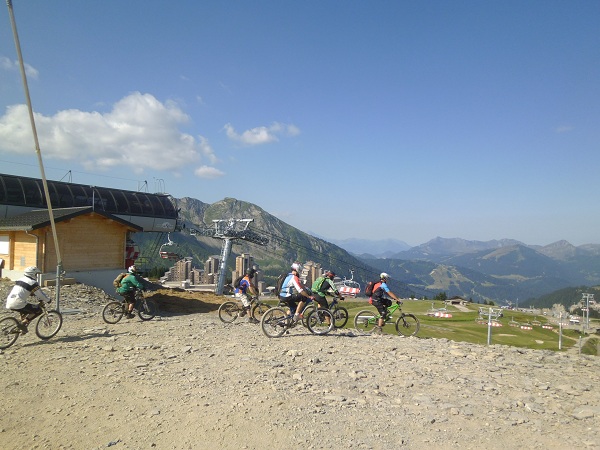 Велосипедисты скатываются с горы. Затем поднимаются на канатной дороге, велосипеды тоже прикрепляются к коляске.