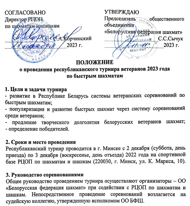 Для участия в турнире приглашаются шахматисты - граждане Республики Беларусь: мужчины 1963 г.р. и старше, женщины 1968 г.р. и старше, оплатившие членский взнос в ОО «Белорусская федерация шахмат» за 2023 год в размере половины базовой величины – 18,50 белорусских рублей.