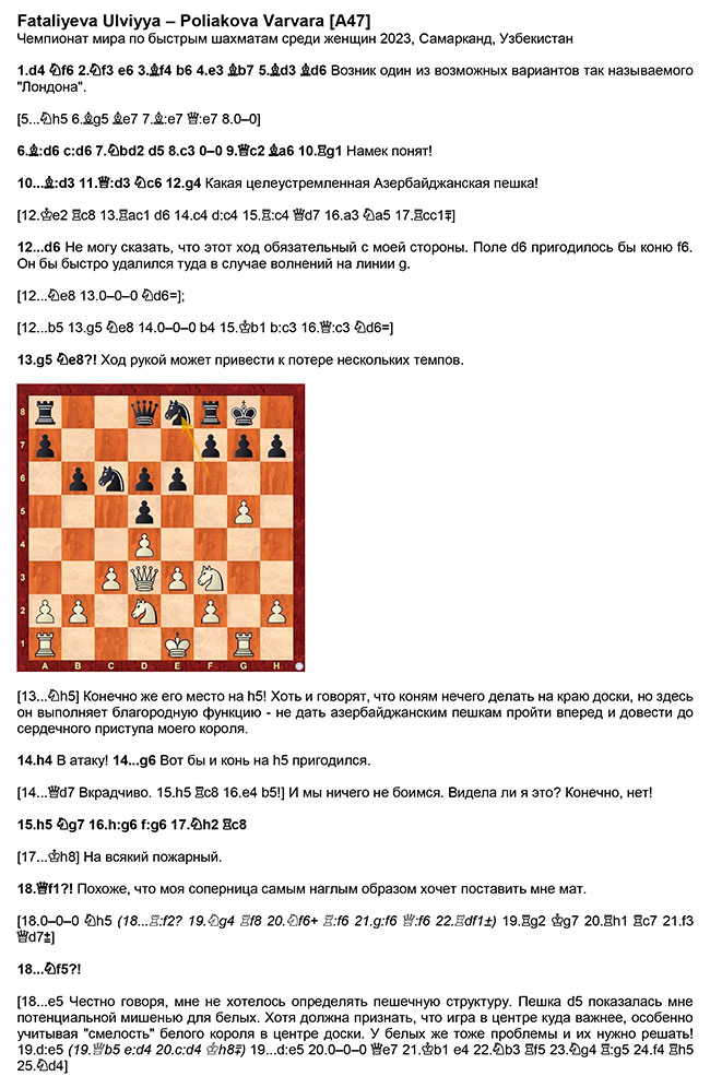 Самая первая партия в рапиде для меня оказалась самой запоминающейся. Я играла черным цветом с Натальей Буксой и одержала победу. Еще хочу отметить партию с девятой чемпионкой мира Жу Чэнь (Чжу Чэнь), в которой удача оказалась на моей стороне. Забавно, что некоторых из моих соперников я вовсе не знала, а они достаточно знамениты. Так, например, в блице я играла с Ю Дженнифер. А потом мне сказали, что она нынешняя восходящая американская звезда. Играла я и с многими россиянками, с которыми пересекались на чемпионатах России в городе Сочи.