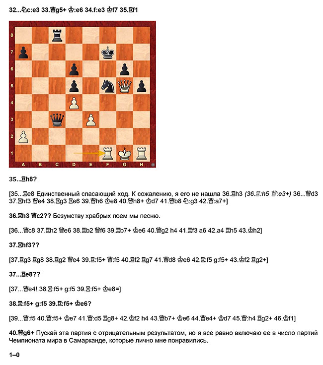 Но сказать, что я особо горжусь какой-то партией, я не могу. Такой нет. Играл не очень. Хотя, наверное, последние две партии в блице были неплохие.