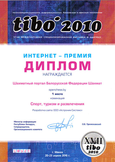 22 апреля в конгресс-холле ГК «Виктория» состоялась церемония награждения победителей престижной интернет-премии ТИБО-2010. Оргкомитет международной выставки «ТИБО» и жюри конкурса признало шахматный портал openchess.by лучшим белорусским интернет-ресурсом в номинации «Спорт. Туризм и развлечения»