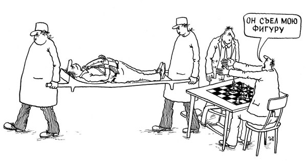 К Михаилу Талю, в бытность его чемпионом мира по шахматам,обратился его приятель, главный врач психиатрической больницы в Риге, с оригинальной просьбой — сыграть пару партий с одним из его больных, возомнившим себя чемпионом мира по шахматам. Сыграть, в смысле выиграть, чтобы излечить больного от мании величия.