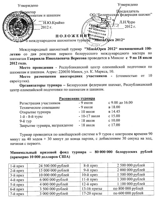 Организаторы международного шахматного турнира «MinskOpen 2012» оставляют за собой право принимать на специальных условиях шахматистов, имеющих, на взгляд организаторов, выдающиеся спортивные достижения и заслуги.