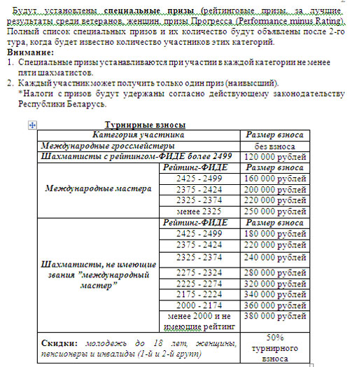 Белорусские шахматисты могут оплатить турнирный взнос по безналичному расчету: УНН 100376428 расчетный счет 3015003290008 в ЗАО ”БелСвиссБанк“, код 175. При регистрации иметь копию платежного поручения.