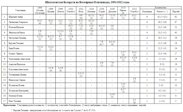 Предлагаем Вашему вниманию сборные таблицы участия наших спортсменов во Всемирных шахматных Олимпиадах за суверенную сборную Беларуси: