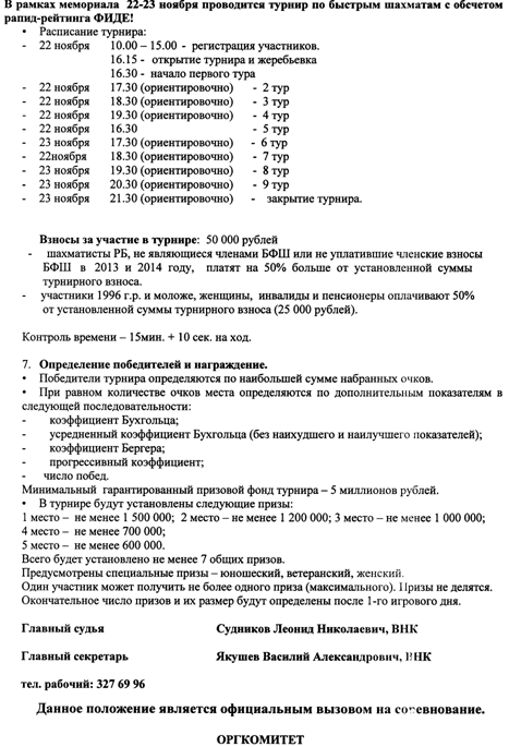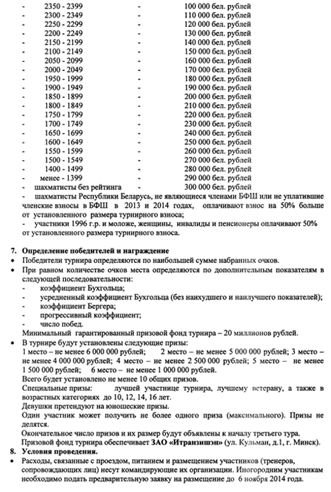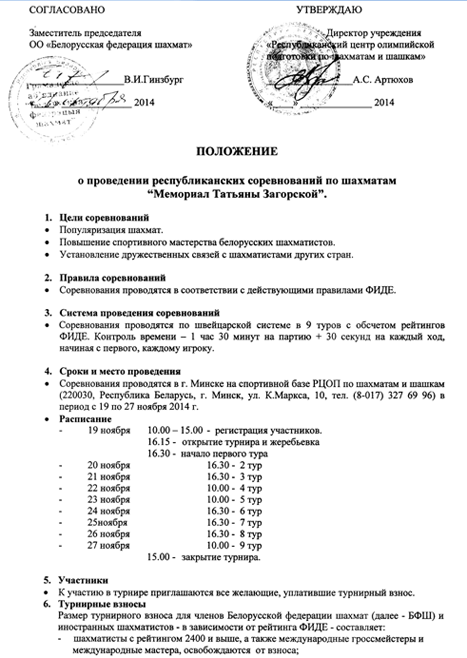 С 19 по 27 ноября в столичном РЦОП по шахматам и шашкам (ул.К.Маркса, 10) проходит открытый республиканский шахматный турнир памяти пятикратной чемпионки Республики Беларусь, мастера спорта СССР Т. В. Загорской. Соревнования проводятся по швейцарской системе в 9 туров c обсчетом рейтингов ФИДЕ. Стартовый протокол насчитывает 106 участников среди которых 5 гроссмейстеров, 4 международных мастера и один мастер ФИДЕ.Результаты. Рапид