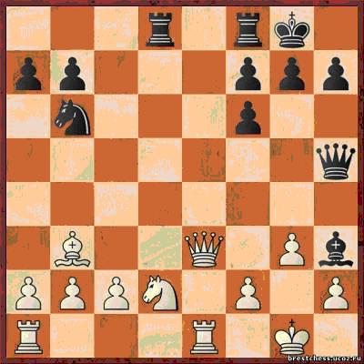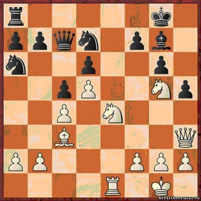 f3! 17.К:d4 [17.g:f3 К:f3+ 18.Крg2 Сh3+19.Кр:f3 Фg4+ 20.Крe3 К:d5+ 21.e:d5 Сg5+; 17.Кc3 f:g2 18.Кр:g2 Сh3+ 19.Крg3С:f1 20.Ф:f1 Фg4#] 17 f:g2 18.Лe1 c:d4 19.c4 Сh3 20.Фf3 Лf8 21.Фg3 Кh5! и ферзь пойман 22.С:b7Кр:b7 0-1