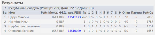 7 место — великолепный результат наших соотечественников. Выше всяких похвал выступил Максим Царук добавив к своему рейтингу более 200 пунктов. Елизавета Щербакова своей уверенной игрой приятно удивила всех белорусских болельщиков и специалистов. Настоящими командными бойцами проявили себя Женя Степкина и Илья Нагибов.