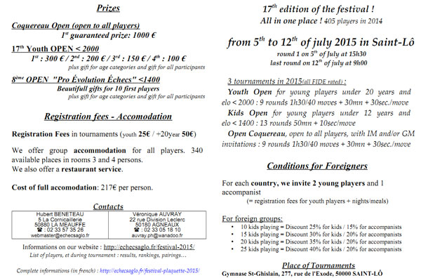 С 5 по 12 июля во французском городе Sent-Lo пройдет 17 шахматный фестиваль. В автобусе, который отправляется из Беларуси осталось 2-3 свободных места. Желающие — присоединяйтесь. По всем вопросам можно обращаться к Зарубицкому Николаю Николаевичу. Тел. +375297136162.