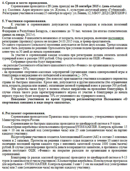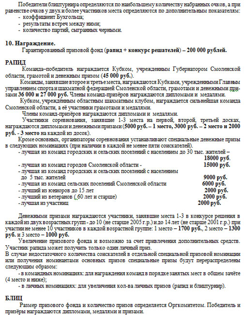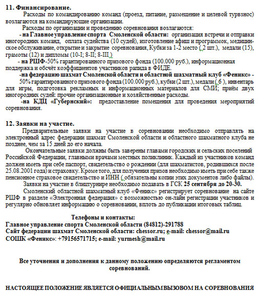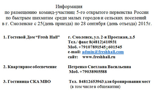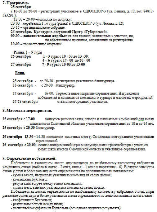 С 25 по 28 сентября в городе Смоленске пройдет V открытое командное первенство России по быстрым шахматам среди малых городов и поселений. К участию в соревнованиях допускаются команды городских и сельских поселений Российской Федерации и Республики Беларусь, с населением до 70 тыс. человек.