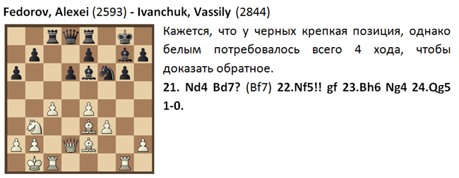 Алексей Федоров стал единственным участником турнира, нанесшим поражение рейтинг-фавориту и прошлогоднему победителю - легендарному Василию Иванчуку. К слову, победа получилась очень быстрой и изящной: