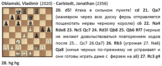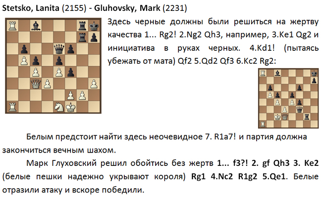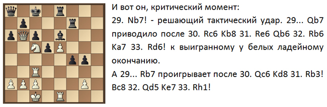 Но коварство быстрых шахмат состоит в том, что в нужный момент не хватает времени досчитать варианты и приходится полагаться на интуицию... 29. Na6? последовало в партии. 29... Qa6 30. Rc6 Kb8! и выясняется, что ферзь с а6 защищает слона! 0-1.