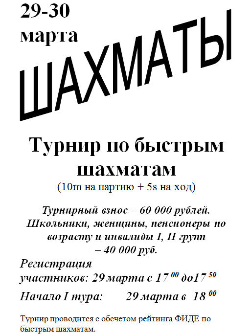 29-30 марта в Республиканском центре олимпийской подготовки по шахматам и шашкам проходит турнир по быстрым шахматам (10минут на партию + 5 секунд на ход).