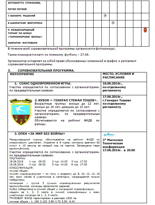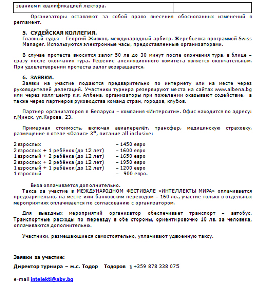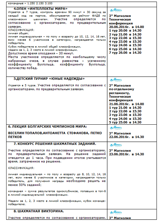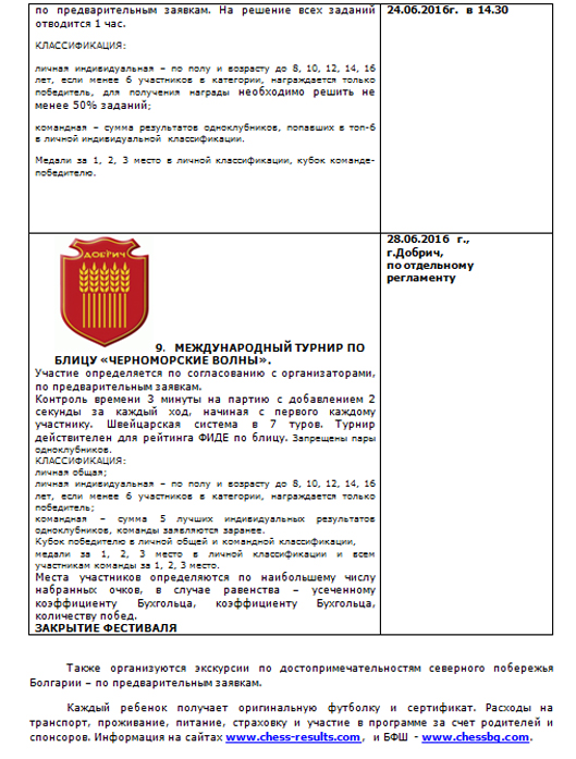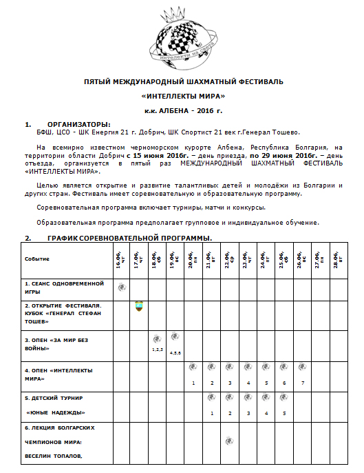 Юбилейный 5-й Международный шахматный фестиваль «Интеллекты Мира» пройдет с 15 по 29 июня 2016 г. в курортном комплексе Албена, Болгария.