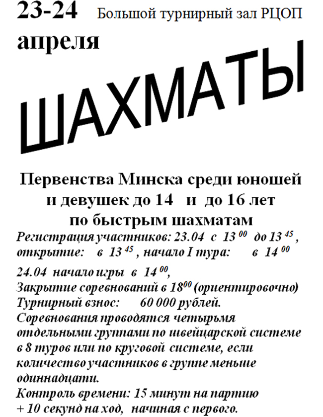 23-24 апреля в большом турнирном зале Республиканского центра олимпийской подготовки по шахматам и шашкам пройдут Первенства Минска среди юношей и девушек до 14, 16 лет по быстрым шахматам.