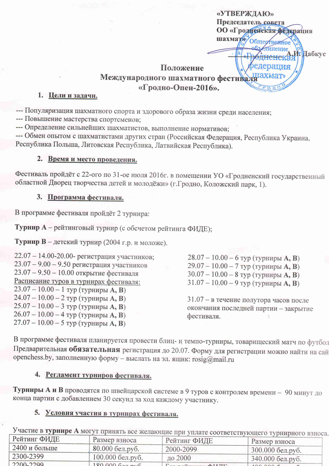 22 июля г. в Гродно (Коложский парк, 1) стартовал международный шахматный фестиваль «Гродно-Опен 2016». В программе фестиваля проходит два турнира:Турнир A – рейтинговый турнир (с обсчетом рейтинга ФИДЕ);