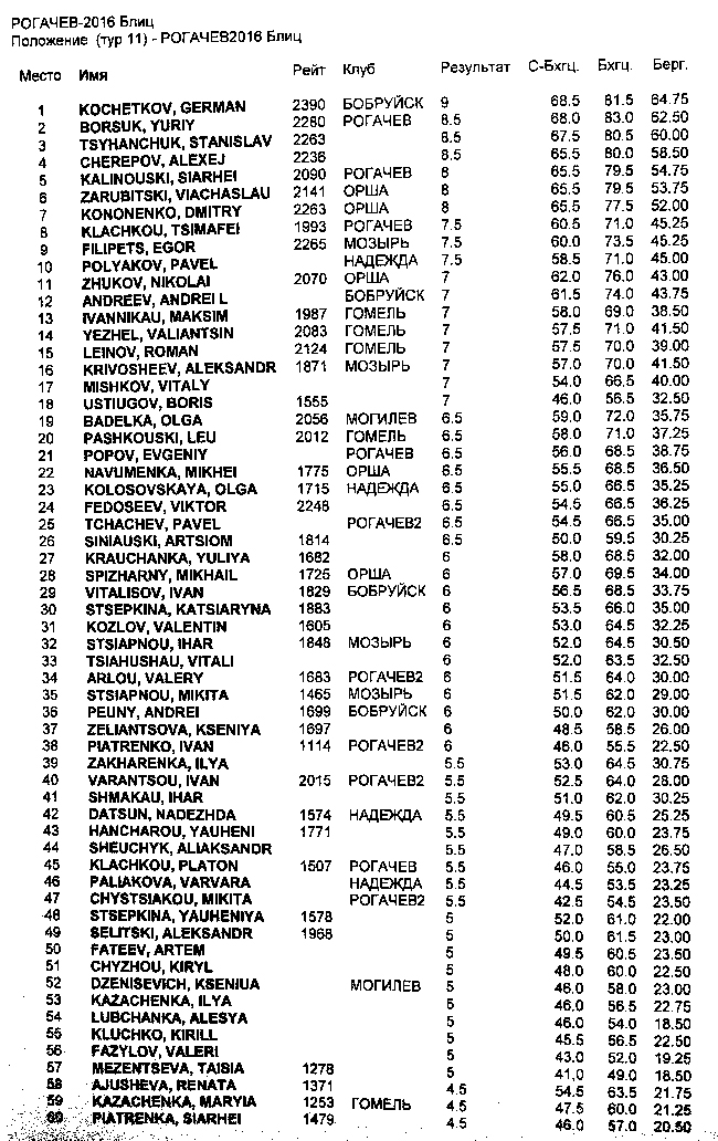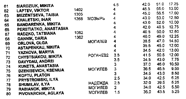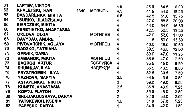 В личном зачете в блиц-турнире места распределились следующим образом: 1 – Кочетков, 2 - Борсук, 3- Цыганчук. Среди юношей до 18 лет: Калиновский, Зарубицкий, Клочков. Среди участников до 10 лет: Науменко, Синявский, Спижарный. Женский приз и приз среди девочек до 10 лет у Баделько Ольги и Денисевич Ксении. Приз среди ветеранов – Андреев А.Л.