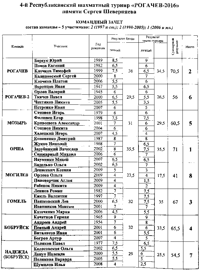 В командном зачете по итогам двух турниров победителем стала команда города Орша (Кононенко, Жуков, Зарубицкий, Спижарный, Науменко). Хозяева турнира заняли второе место, состав команды Рогачева - Борсук, Попов, Калиновский Клочков Т., Клочков П. Третье место у команды из Гомеля (Леинов, Ежель, Иванников, Пашковский, Казаченко).