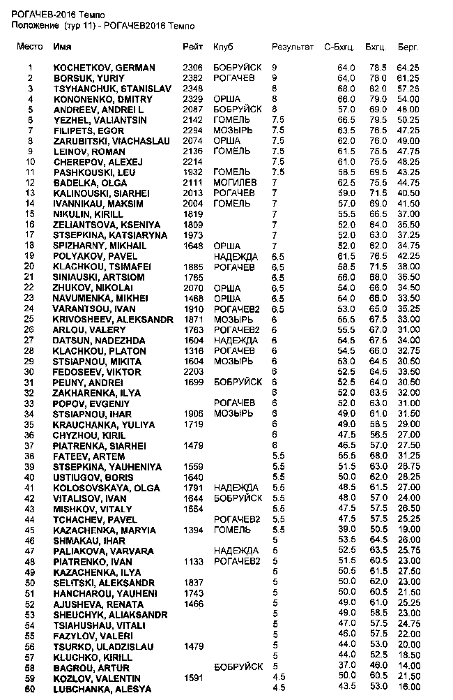 Призерами темпо-турнира также стали: Кочетков, Борсук, Цыганчук. Среди юношей до 18 лет: Филипец, Зарубицкий, Пашковский. Среди участников до 10 лет: Спижарный, Синявский, Науменко. Женский приз и приз среди девочек до 10 лет: Зеленцова Ксения и Аюшева Рената. Победители среди ветеранов – рогачевцы Воронцов И.С. и Орлов В.Д.