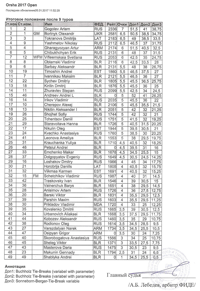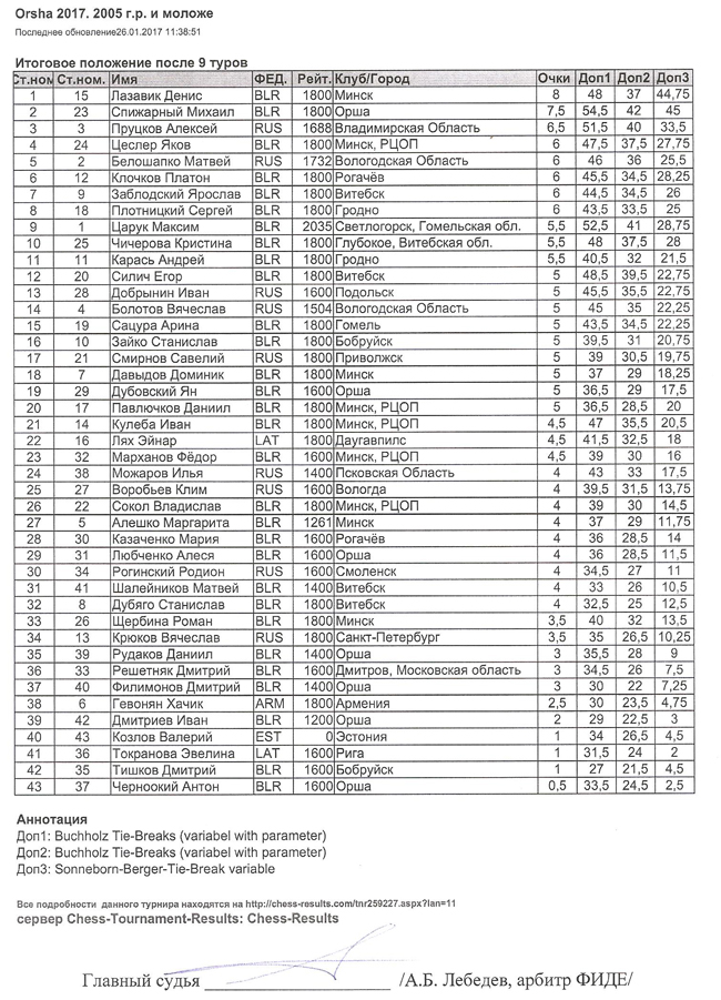 26 января 2017 года в гостеприимном ледовом дворце г.Орши завершился XV международный шахматный фестиваль "Орша-2017". Все итоговые результаты турниров