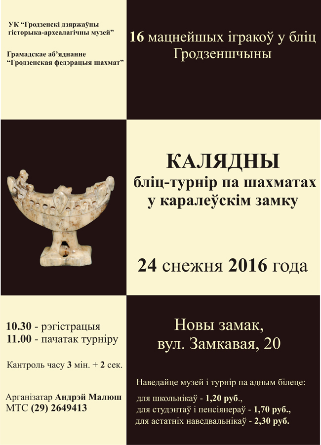 24 декабря 2016 года в Гродненском историко-архелогическом музее, расположенном в Новом замке по ул.Замковой,20 состоится блиц-турнир сильнейших шахматистов г.Гродно. Так в 11:00 часов 24.12.2016 в 11:00 часов на втором этаже музея, что происходит впервые в Республики Беларусь, под эгидой Гродненской федерации шахмат, под патронажем Гродненского историко-архелогического музея, лучшие шахматисты Гродненщины будут определять победителя шахматного «калядного» турнира. Турнир состоится по круговой системе с контролем времени три минуты на партию плюс добавление две секунды на ход.Организатор: председатель совета ОО «ГФШ» А.М.Малюш.