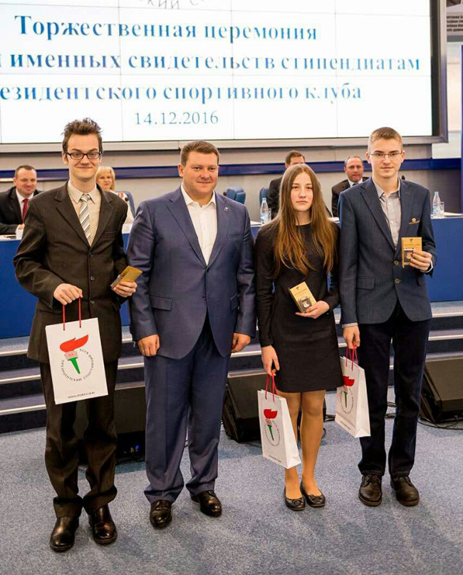 В зале олимпийской славы Национального олимпийского комитета состоялась традиционная церемония вручения свидетельств стипендиатов Президентского спортивного клуба. Двести десять талантов из числа перспективных спортсменов, спортсменов-паралимпийцев и тренеров-преподавателей были определены центральным советом Президентского спортивного клуба в качестве стипендиатов на 2017 год. В число избранных попали самые перспективные представители тридцати трех видов спорта. Среди них и три юных представителя шахмат: Вячеслав Зарубицкий, Ольга Баделько и Михаил Никитенко.