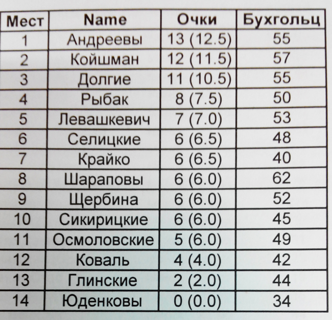 14 | Лапицкие | 7 (6.5) | 42 |
