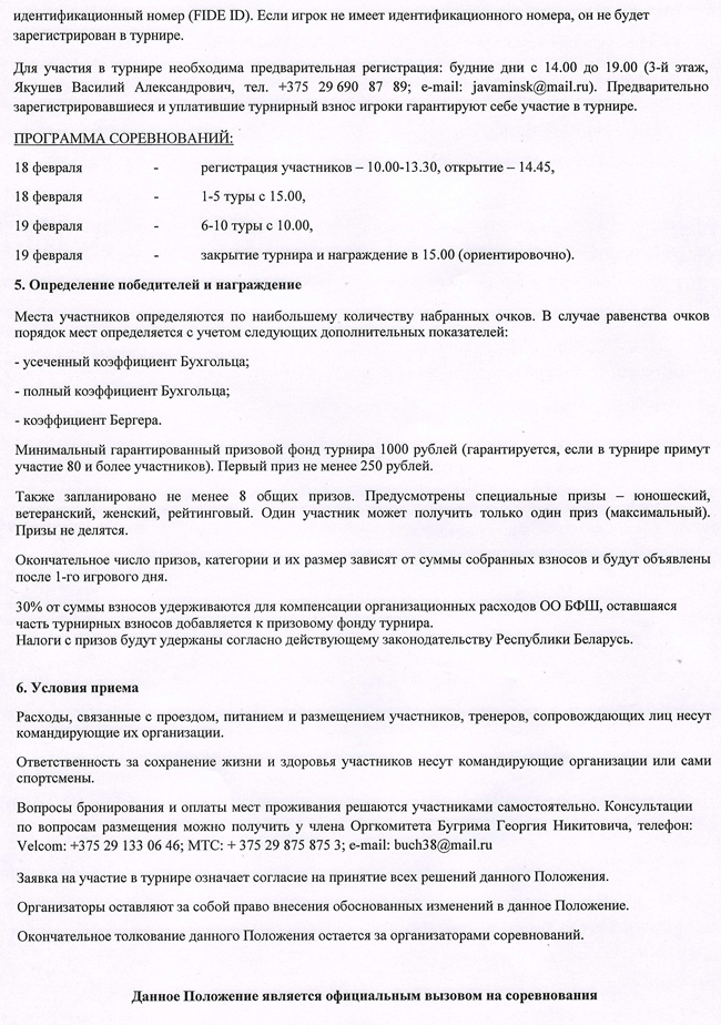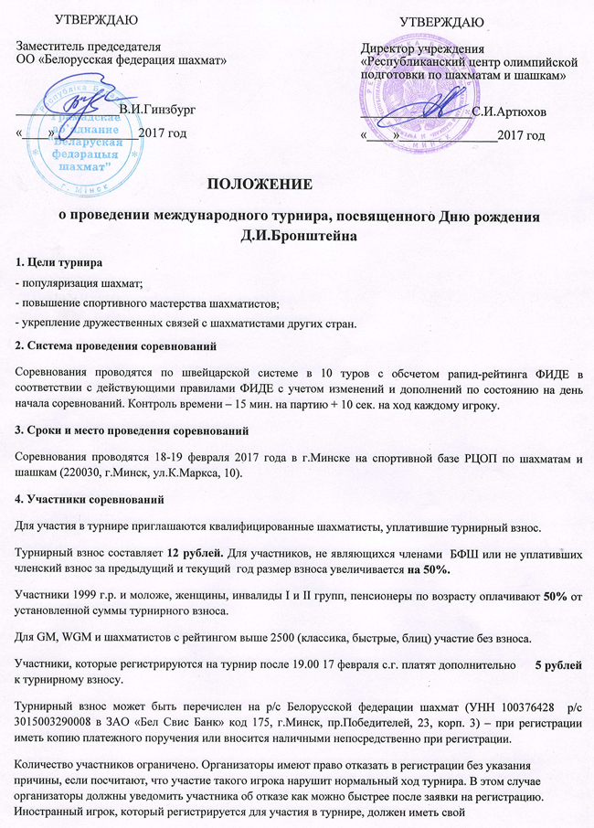 19 февраля в Минске на спортивной базе РЦОП по шахматам и шашкам (220030, г. Минск, ул.К.Маркса, 10, тел. +375 17 327 69 96) финишировал международный турнир, посвященный дню рождения Д.И.Бронштейна.Турнир проходил по швейцарской системе в 10 туров с обсчетом рапид-рейтинга ФИДЕ в соответствии с действующими правилами ФИДЕ.