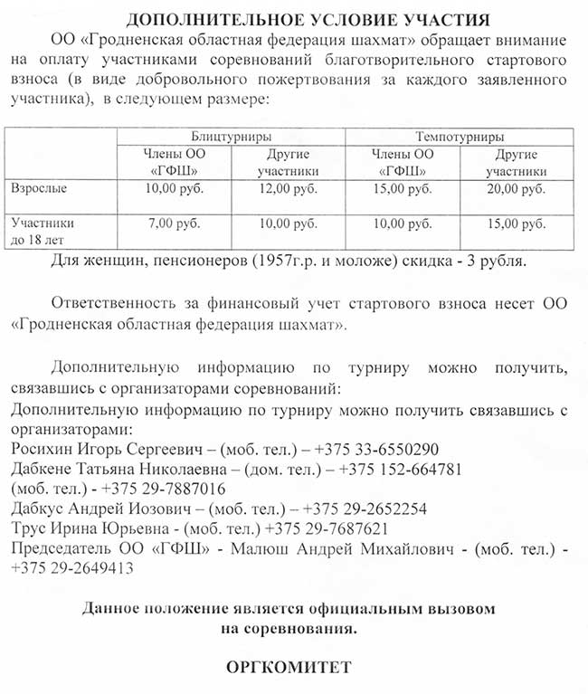 В связи с часто задаваемыми вопросами по турнирным взносам в детских турнирах (А и В) "17-го Мемориала Й.М.Дабкуса" оргкомитет информирует: турнирные взносы - 10 рублей (для участников-членов ГФШ), 15 рублей (для остальных участников).