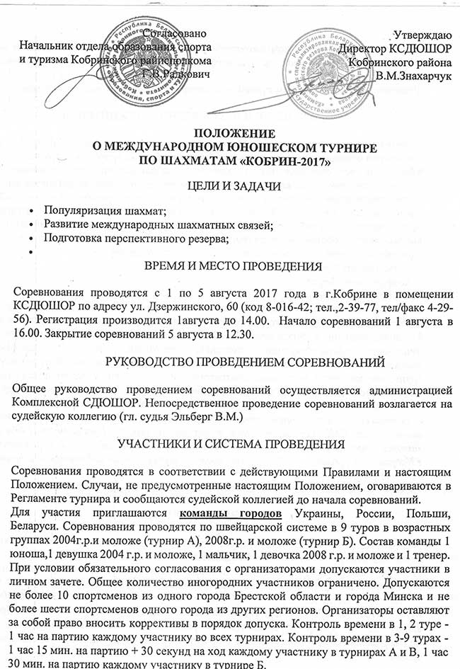 С 1 по 5 августа в городе Кобрине в помещении КСДЮШОР (ул.Дзержинского, 60) пройдет международный юношеский турнир по шахматам "Кобрин-2017".