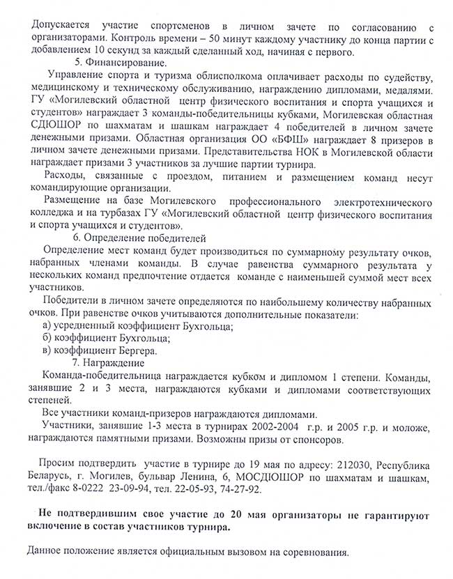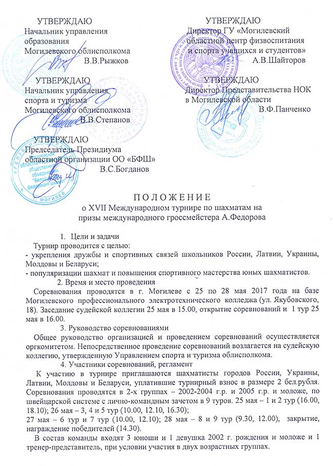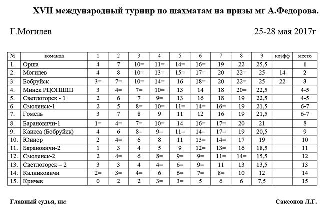 В Могилёве финишировал XVII Республиканский турнир по шахматам на призы МГ А.Фёдорова. В нём принимали участие 99 юных шахматистов из 9 городов Беларуси и Смоленска.Итоговые таблички: