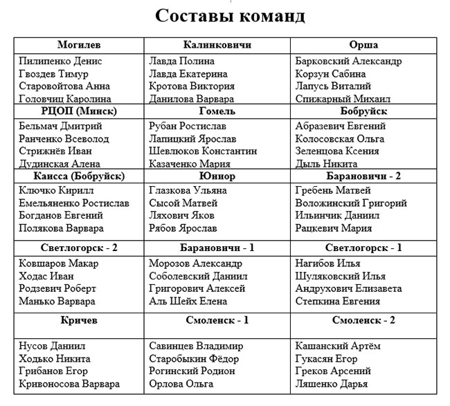 Place Name Feder Rtg Loc Score M-Buch. Buch. Berg. 1 Лапусь Виталий, Орша 1800 2004 7.5 39.0 49.5 42.00 2 Морозов Александр, Брнв 1800 2002 6.5 39.5 52.0 34.00 3 Старовойтова Анна, Мг 2000 2002 6.5 38.0 49.5 33.50 4 Шуляковский Илья, Свет 2000 2002 6.5 34.5 41.5 27.25 5 Колосовская Ольга, Бобр 2000 2002 6 41.5 54.0 35.75 6 Глазкова Ульяна, Мг 1800 2002 5.5 37.5 49.0 26.50 7 Рубан Ростислав, Кали 1800 2002 5.5 37.5 48.5 27.00 8 Корзун Сабина, Орша 1800 2003 5.5 35.5 43.5 23.00 9 Савинцев Владимир, Смол 1800 2004 5.5 35.0 46.0 23.50 10 Нагибов Илья, Свет 1800 2003 5.5 32.5 40.5 21.00 11 Пилипенко Денис, Мг 2000 2003 5 39.5 51.0 26.75 12 Стёпкина Евгения, Свет 1800 2003 5 35.5 47.0 22.75 13 Барковский Александр, Орша 1800 2002 5 33.5 43.5 21.75 14 Бельмач Дмитрий, Мин 1800 2005 5 29.5 35.5 17.25 15 Котляров Никита, Мг 1800 2003 5 25.0 31.0 13.75 16 Соболевский Даниил, Брнв 1800 2004 4.5 33.5 43.0 19.50 17 Ключко Кирилл, Бобр 1800 2003 4.5 31.5 41.0 16.25 18 Гребень Матвей, Брнв 1400 2004 4.5 30.0 39.0 11.00 19 Емельяненко Ростислав, Бобр 1800 2002 4.5 28.5 35.5 12.75 20 Аль Шейх Елена, Брнв 1600 2004 4 33.5 43.0 18.50 21 Дегтерёв Никита, Мг 1800 2002 4 32.0 41.0 14.50 22 Ковшаров Макар, Свет 1800 2003 4 27.5 33.5 10.00 23 Новиков Антон, Мг 1800 2002 4 24.0 31.0 8.00 24 Гинько Владислав, Мг 1800 2004 4 23.0 30.0 8.00 25 Калиновский Николай, Гом 1600 2004 3.5 29.5 36.5 12.25 26 Кашанский Артём, Смол 1600 2002 3.5 28.0 35.0 9.50 27 Фильченко Никита, Мг 1800 2003 3.5 26.5 32.0 8.50 28 Тандилян Эдвард, Бобр 1600 2003 3 30.5 37.0 10.00 29 Лавда Полина, Клнк 1400 2004 3 26.5 33.5 4.25 30 Володин Павел, Смол 1400 2002 2 23.5 29.5 1.75 31 Ходько Никита, Крич 1600 2004 1.5 27.0 34.0 4.00 32 Нусов Данила, Крич 1600 2002 0.5 31.0 39.0 1.00