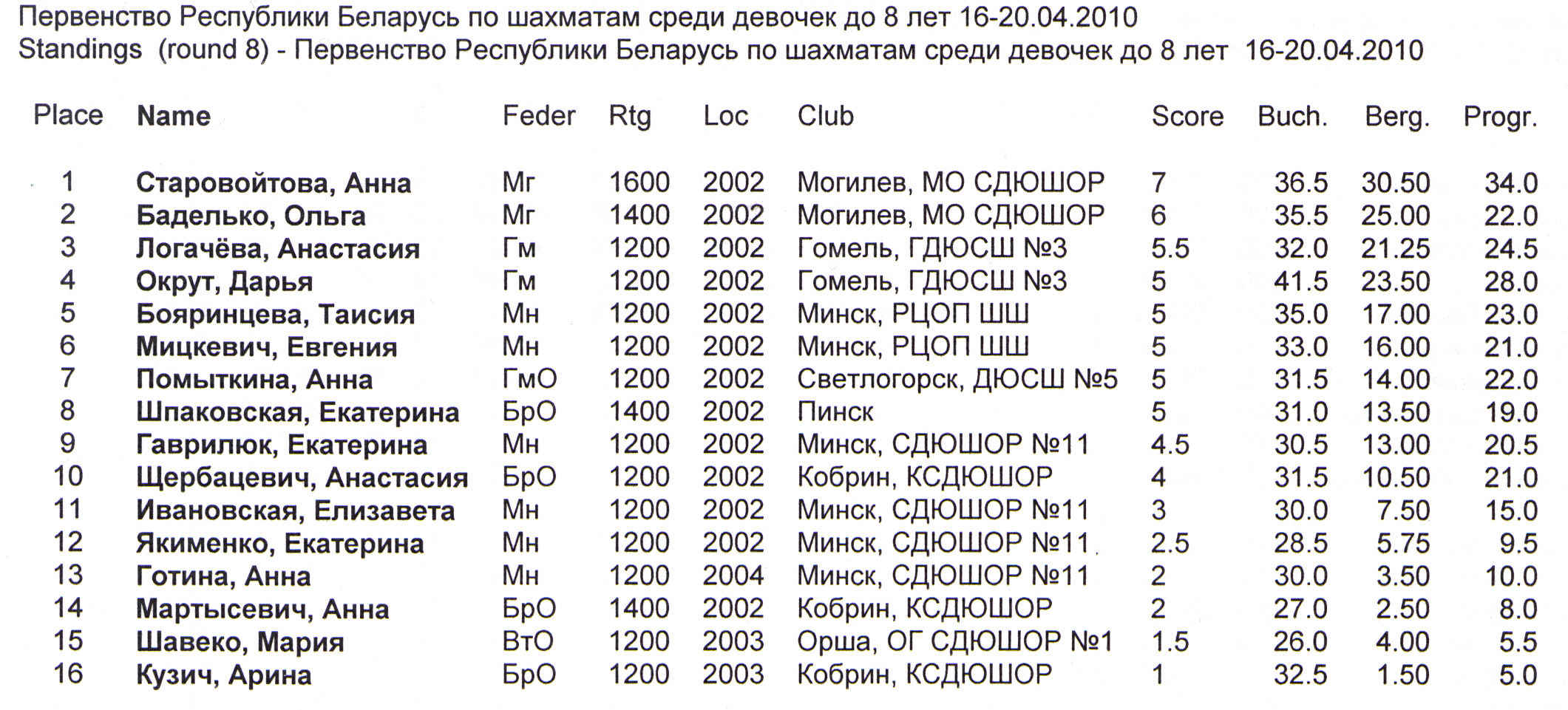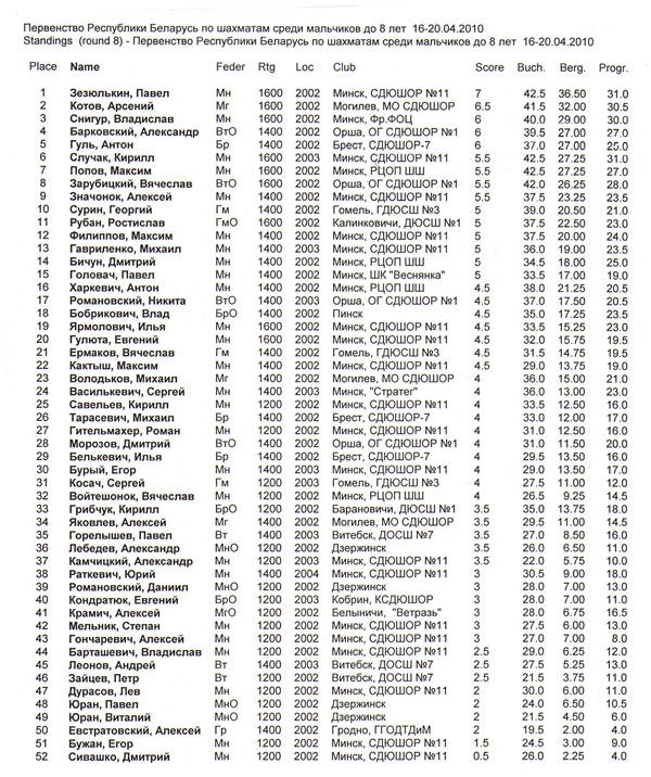 5-дневный 8-туровый марафон позади и сегодня уже стали известны имена призеров самых юных чемпионов Беларуси 2010 года — победителей Первенств в возрасте до 8 лет