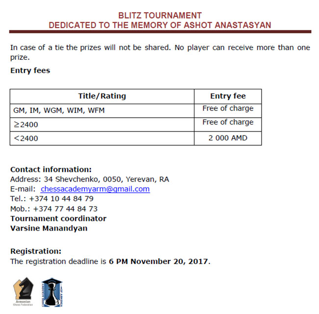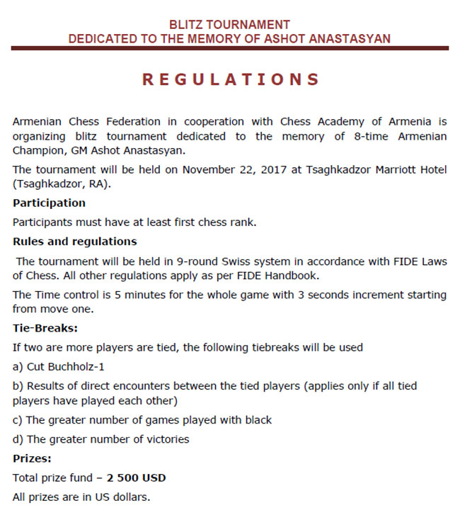22 ноября 2017 года Шахматная федерация Армении совместно с Академией шахмат Армении проведут блиц турнир памяти 8-кратного чемпиона, гроссмейстера Ашота Анастасяна.