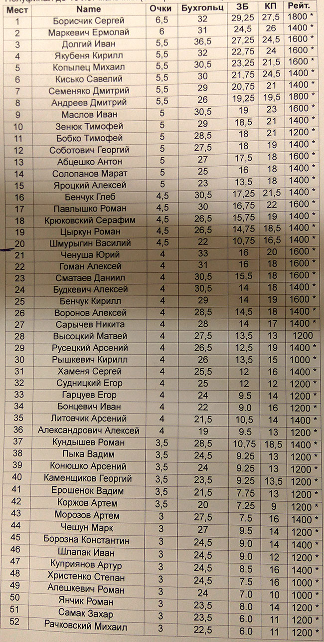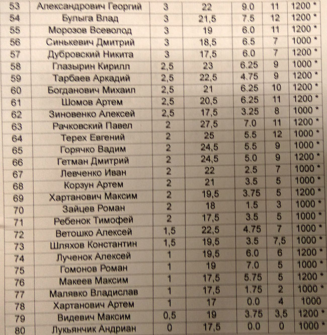 29 | Малевич Александр | 2,5 | 21,5 | 5.5 | 11 | 1600 * |