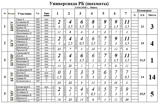 6 апреля в столичной СДЮСШОР №11 завершилась Универсиада по шахматам среди вузов Республики Беларусь. Сразу 4 команды набрали одинаковое количество очков, лишь дополнительные показали определили победителей и призеров.