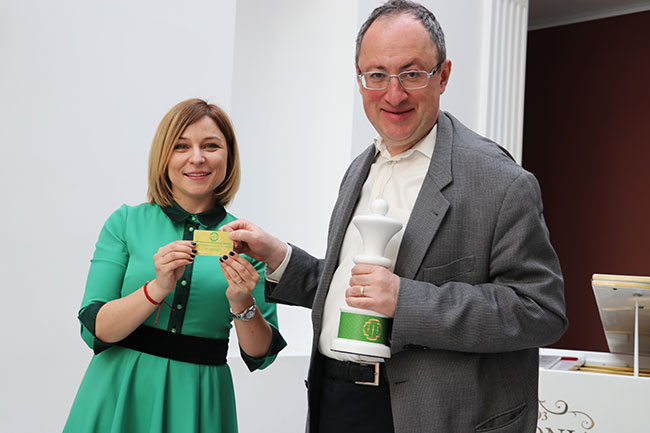 Председатель ОО "БФШ" Анастасия Сорокина вручила Борису Абрамовичу стильного ферзя и карточку почетного члена Белорусской федерации шахмат.