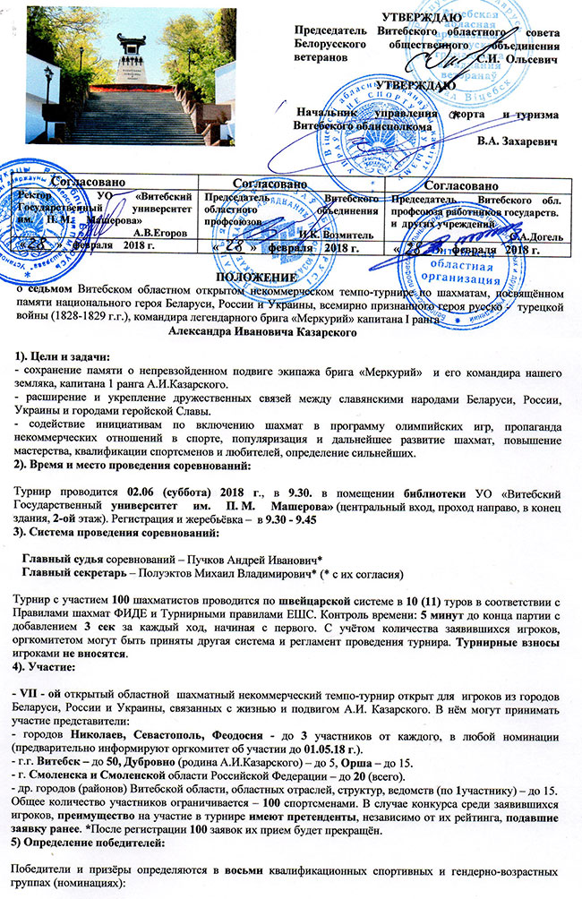 Витебский областной совет ветеранов БООВ совместно с управлением спорта и туризма облисполкома, областным профсоюзом работников госучреждений и ректоратом университета им. П.М. Машерова проводит в помещении библиотеки 02 июня в г. Витебске седьмой открытый областной шахматный темпо-турнир с участием 100 участников, посвященный памяти Александра Ивановича Казарского. Наш земляк, герой русско-турецкой войны 1828 – 1829 года, уроженец Дубровно, командир легендарного брига «Меркурий» капитан I ранга прославил себя на века, одержав победу на 18-пушечном парусном бриге в невероятном сражении с двумя трёхпалубными турецкими линейными кораблями, намеревавшимися его пленить. Имея 184 пушки, а c учётом их калибра, превосходство противника было 30-кратным, ведомые самим капудан-пашой и другим адмиралом флагманского корабля, турки приготовились уже к сдаче «Меркурия». По всем канонам и уставам морских держав командир корабля имел право опустить флаг и сдаться при двукратном превосходстве вооружения противника. А здесь 30-кратное! Но не тут-то было. Командир и вся команда приняли решение сражаться до последнего, а в случае опасности подорвать бриг, сцепившись с одним из преследовавших кораблей. Благодаря правильно избранной тактике, бой, длившийся почти 3.5 часа на виду всей османской эскадры, насчитывавшей 16 единиц, закончился для турок бесславно. Они ничего не смогли поделать с непокорным бригом, его бесстрашной командой, блиставшей мастерством маневра и боевой выучкой экипажа. Посбивав туркам паруса и лишив их хода и манёвренности, бриг, хотя и сам понёс потери в команде и получил серьёзные повреждения, ушел от преследования. Штурман флагманского корабля турок чуть позже писал «…Дело неслыханное и невероятное. Мы не могли заставить его сдаться: он дрался, ретируясь и маневрируя со всем искусством опытного военного капитана, до того, что стыдно сказать, мы прекратили сражение, и он со славою продолжил свой путь … Ежели в великих деяниях древних и наших времён находятся подвиги храбрости, то сей поступок должен все оные помрачить, и имя сего героя достойно быть начертано золотыми литерами на храме Славы: он называется капитан-лейтенант Казарский, а бриг – «Меркурий»…». (Это письмо штурмана турецкого корабля от 15.05-1829 г. переправлялось адресату купцами, но было перехвачено русскими агентами, а через датского посланника Гюбша, доставлено … к министру иностранных дел, будущему канцлеру России К.В.Нессельроде …). Командующий Османским флотом, капудан-паша Ахмед – Папуджи, вспоминая позже о случившемся конфузе, храбрился и одновременно бесился от сожаления и собственного бессилия: «Заяц был в моих руках, но собаки мои испугались собственного лая: при первом пролетевшем ядре они бросили орудия. Увы! Наши храбрые пали при Наварине !» (из опубликованных воспоминаний английского лейтенанта Следа, морского советника султана).Об этом подвиге брига «Меркурий» взахлеб писали тогда почти все российские газеты того времени. Он взбудоражил не только Россию, но и Европу. Этот подвиг воспет поэтами и прозаиками с мировым именем, Д.Давыдовым, В. Далем, Л. Толстым, А. Пушкиным, П. Вяземским, а также в народной морской песне – Казарская. Известные маринисты отразили подвиг на своих полотнах. И. Айвазовский посвятил ему три картины, хранящихся в картинных гале