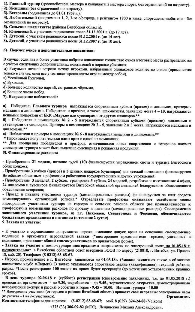Что касаемо турнира, то время его проведения выбрано между двумя датами: днём выдающегося, непревзойдённого в мире боя 14 (27) мая 1829 года и днём рождения героя. В текущем году исполняется 220 лет со дня его рождения и 185 лет со дня смерти, 16 (28) июня. При проведении данного турнира, носящего имя А.И. Казарского, участники имеют возможность ознакомиться на прикладных материалах и спортивной атрибутике, специально изготовленных, с героизмом нашего земляка, оказавшегося в экстремальной ситуации. Такие сообщения оставляют очень глубокий след у всех участников. Девизом этого турнира являются слова Ф. Булгарина, опубликованные им в 1830 году применительно к описанию портрета А.И. Казарского и вынесенные на афишу - "Отцы и наставники, указывайте детям на портреты славных мужей своего Отечества и повторяйте повествования об их подвигах ...". К нему приглашаются все желающие, независимо от возраста и пола, шахматных званий и регалий, будь то гроссмейстер или любитель. Будут выявлены победители и призёры в восьми номинациях: в главном турнире среди мастеровитых шахматистов, среди женщин, ветеранов, сельских шахматистов, детей и юношей, а также любителей. К участию будут допущены все желающие, подавшие заявки не позднее 10 мая. Подобные турниры позволяют, в первую очередь, детям и юношам набираться турнирного опыта в игре с более опытными и рейтинговыми шахматистами, такой опыт для них неоценим. Это особенно важно в связи с оформлением Белорусской шахматной федерацией заявки, принятой и зарегистрированной ФИДЕ официально, о проведении в Минске в 2022 году Всемирной шахматной олимпиады. Как знать, может быть, кто-либо из наших нынешних школьников из Витебска, Орши и др., участвующих в этом и подобных им турнирах, соперничая с взрослыми мастерами и гроссмейстерами, наберётся опыта и будет уже отстаивать честь страны, даже посягнёт на главный титул Всемирной шахматной олимпиады? Это вполне возможно! В области уже появилась юная поросль способных шахматистов, покорявших вершины европейских и мировых высот в своей возрастной категории. Как знать, может среди них найдутся те, устремлённые к покорению новых вершин? Ничего невозможного нет, особенно при большом желании достичь цели и упорно трудиться над её осуществлением.