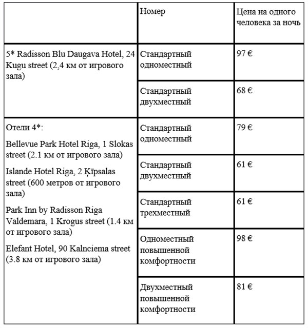 11.1 Проживание с полным пансионом (шведский стол) в период с 19 по 30 августа в Риге предоставляется следующим образом. Каждая национальная федерация может выбрать уровень отеля (5*, 4*, 3* или хостел). Все приглашенные и дополнительные игроки одной федерации будут размещены в выбранном типе отеля. Федерации обслуживаются в порядке очереди.
