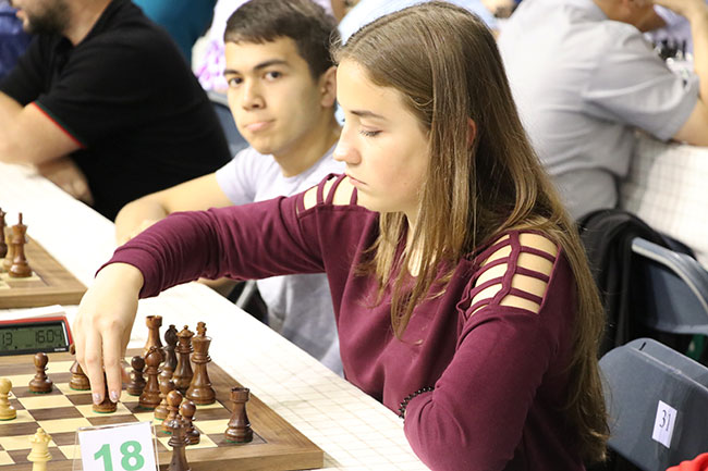 Возвращаемся снова в турнирный зал и наблюдаем за партией двух красивых девушек Натальи Жуковой и Ангелины Узловатой. Наталья черными одержала уверенную победу и вплотную приблизилась к лидерам.