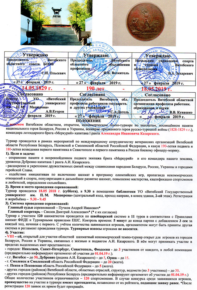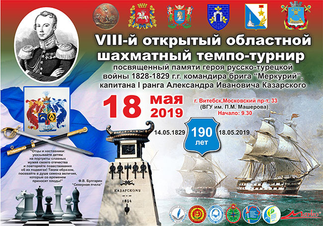 18 мая в Витебске пройдет 8-й открытый областной некоммерческий смешанный шахматный темпо-турнир памяти героя Русско-Турецкой войны 1828 - 1829 г.г. Александра Ивановича Казарского, капитана I ранга, командира легендарного российского брига "Меркурий". В текущем году темпо-турнир приурочен к 190-ой годовщине открытия ему памятника, первого в России памятника боевому моряку-офицеру, первого из 2000 памятников в Севастополе, девятого по счету персонального памятника вообще - известным историческим личностям в России (после возведения памятников - Петру Первому, Минину и Пожарскому, М. Ломоносову).