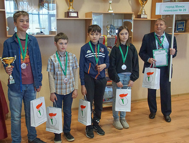 Лучшие по доскам: 1 доска - Глеб Галкин (Минск, Гимназия №29), 2 доска - Никита Дыль (Бобруйск, Гимназия №1), 3 доска - Денис Зарецкий (Кобрин, СШ №8), 4 доска - Ксения Зеленцова (Бобруйск, Гимназия №1).