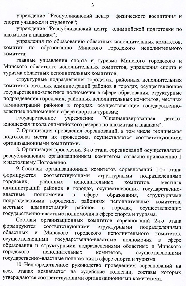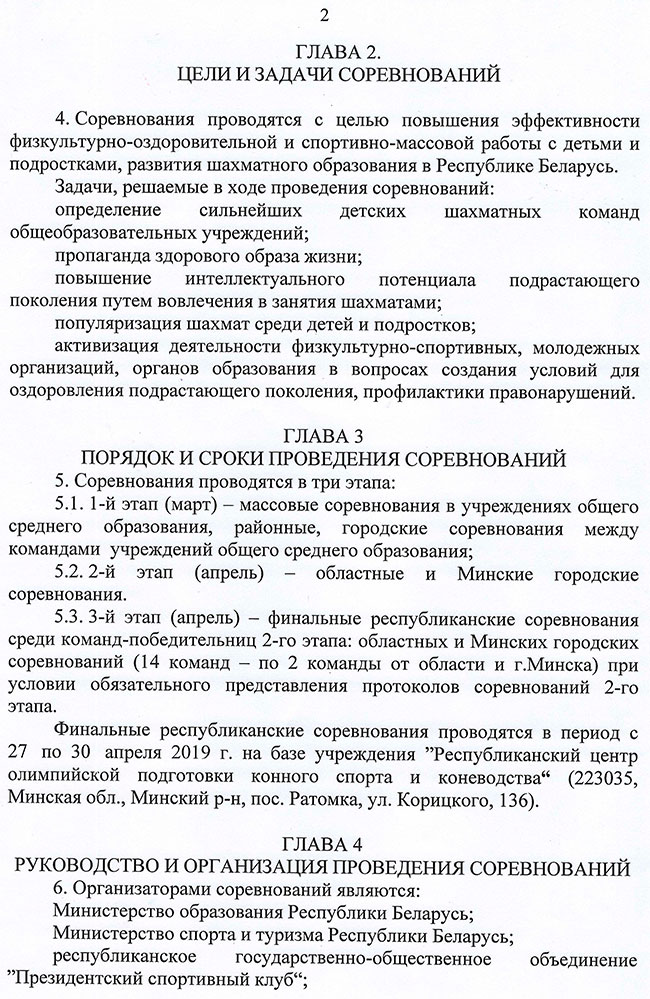 27 апреля: отъезд команд от РЦОП по шахматам и шашкам (ул. К.Маркса,10) к месту проведения соревнований – с 11.00 до 12.00; мандатная комиссия и регистрация участников с 12.00 до 13.00; обед – с 14.00 до 15.00; открытие соревнований в 15.30; 1 тур с 16.30 до 18.45; ужин с 19.00 до 20.00.